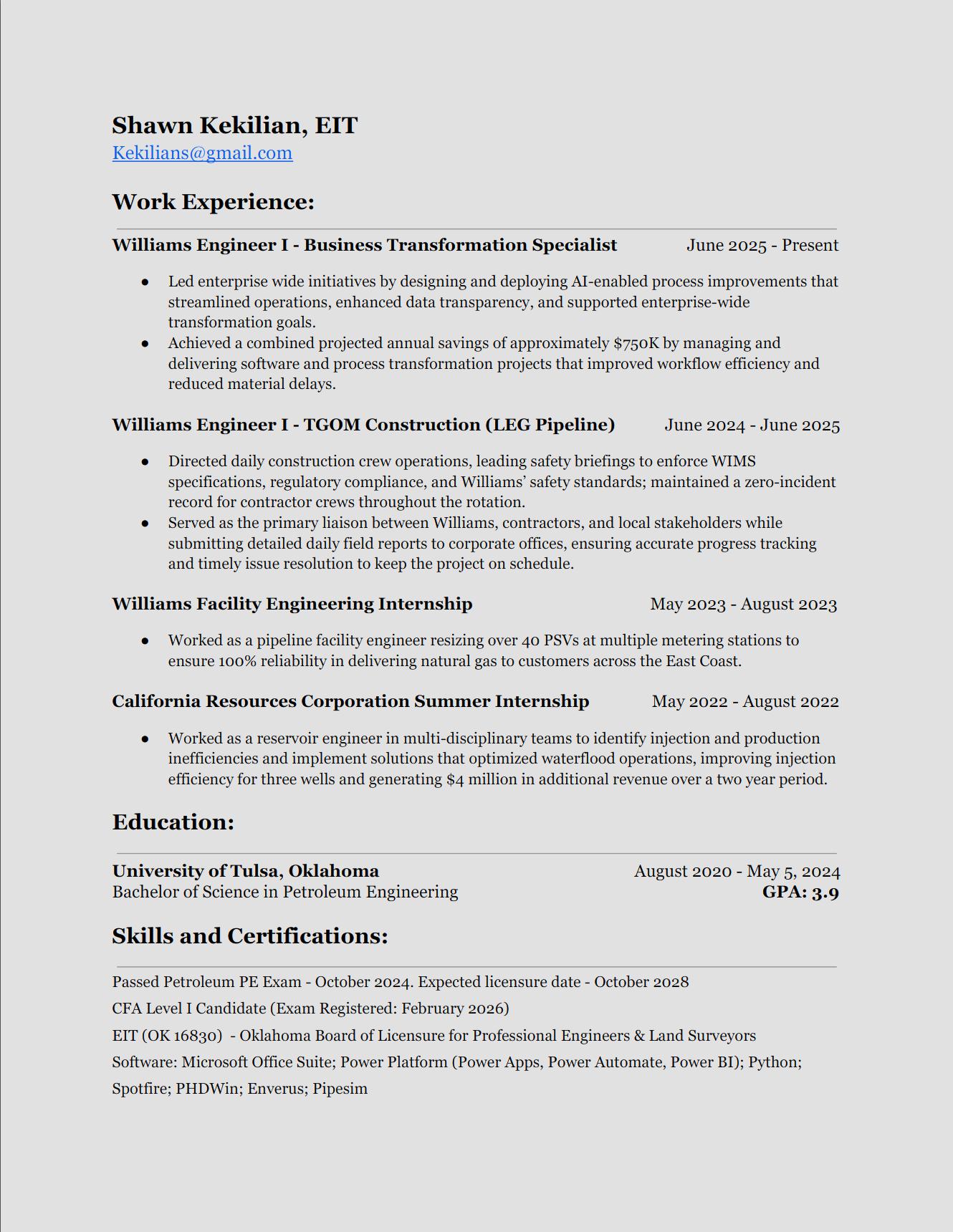 All this to say, I believe I’ve built a unique set of skills that set me apart from other professionals my age. I gained project management experience early in my career through both construction and business transformation; I’m an EIT who has passed the PE exam and am on track to become a licensed PE in the next few years; I’m building my business and financial acumen in my current role; I’m studying for the CFA with the goal of one day working in finance; and I’ve developed exceptional people skills that I can bring into a career in either engineering or finance.