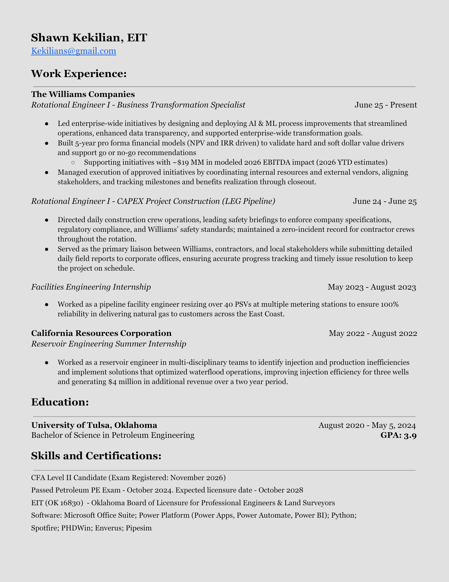 Having worked in construction during my last rotation and in field positions during my internships, I wanted to build my business and financial acumen. Over time, I realized my interest and passion for investing and the stock market have taken up more and more of my time outside of work. Taking a role at Williams’ corporate office is giving me a better understanding of how business decisions are made and how to maximize outcomes for all stakeholders involved in a project.